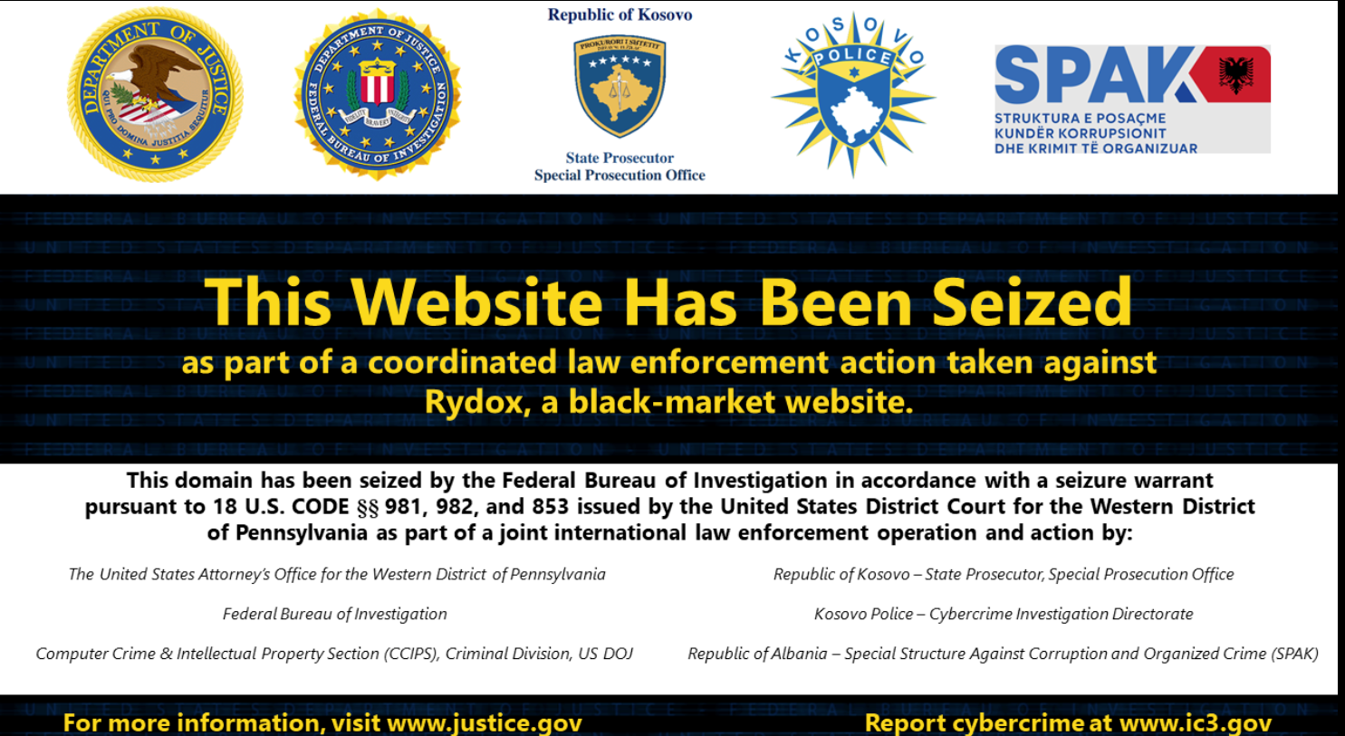The domain, Rydox.cc, and its associated servers were seized in Kuala Lumpur, Malaysia. Additionally, U.S. authorities seized approximately $225,000 in cryptocurrency linked to the defendants.