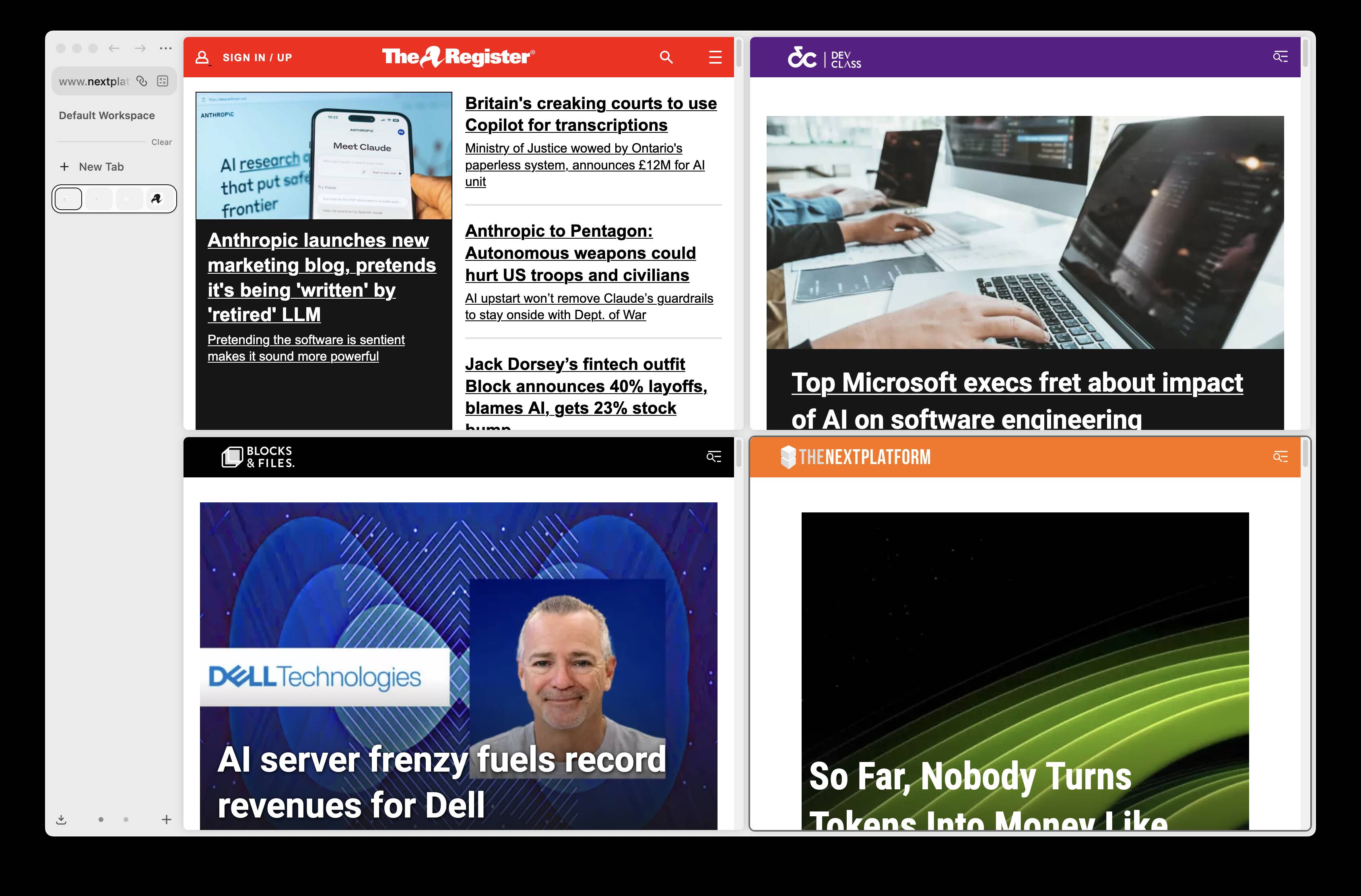 Zen showing a 2x2 arrangement of El Reg, Dev Class, Blocks and Files, and The Next Platform.