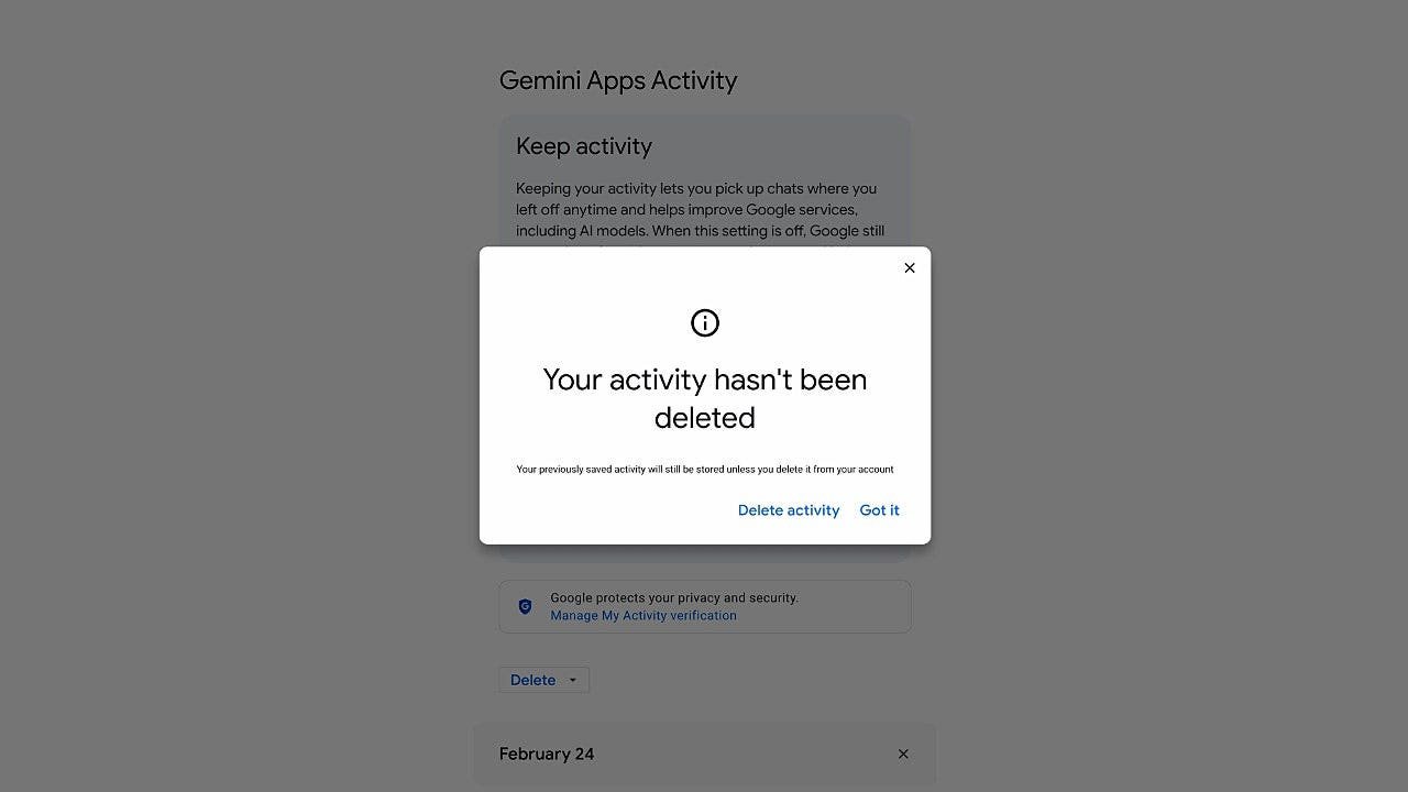 Google’s Gemini activity settings show how your AI interactions may still be stored unless you delete them. (Kurt “CyberGuy” Knutsson)