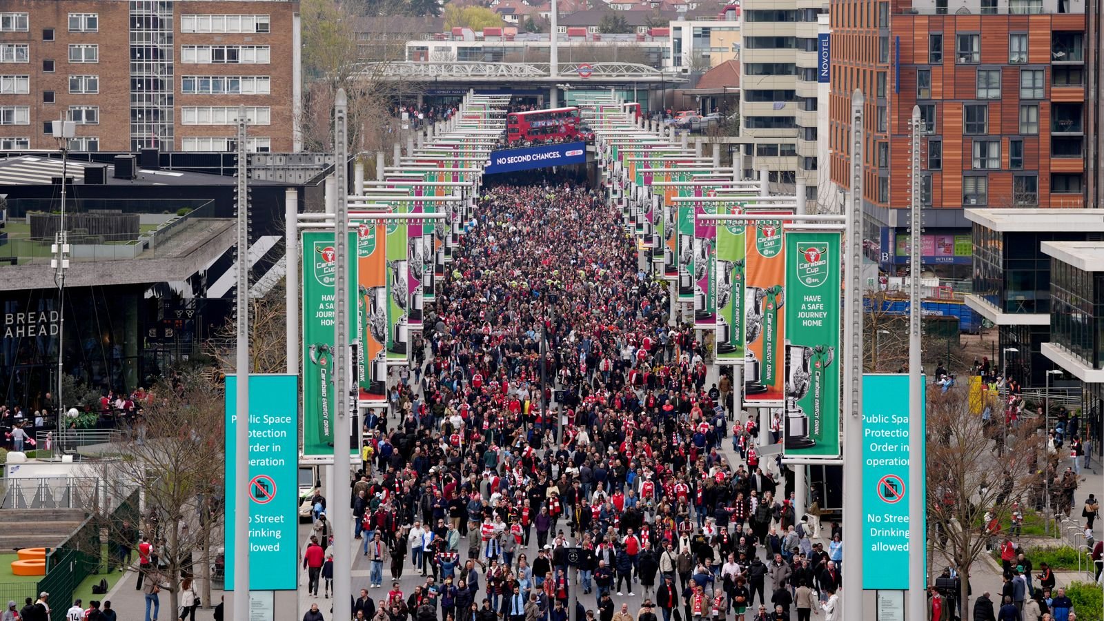 Fans arriving at Wembley ahead of Sunday’s Carabao Cup final, but not everyone had tickets. Pic: PA