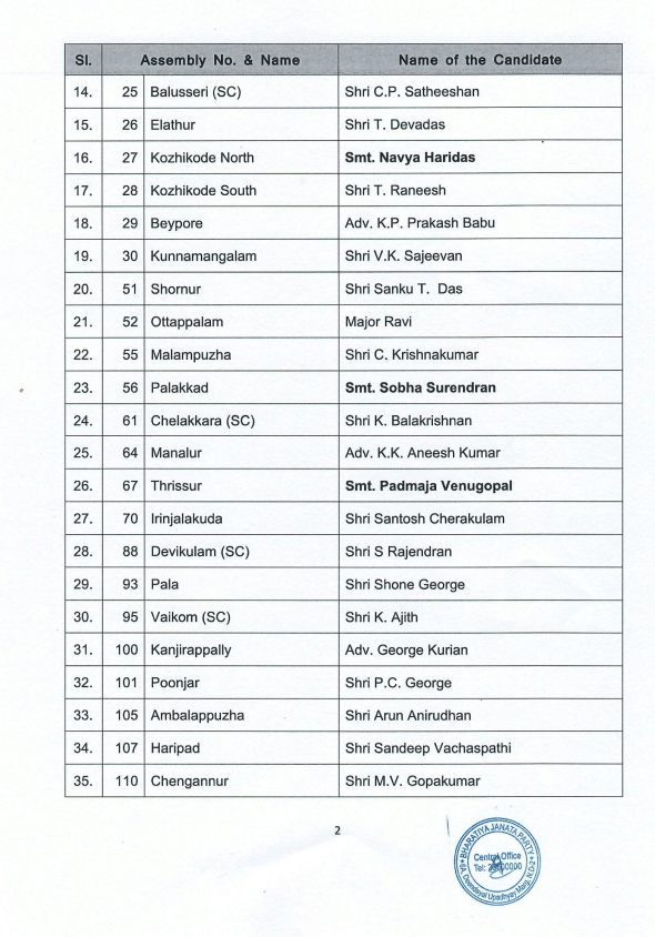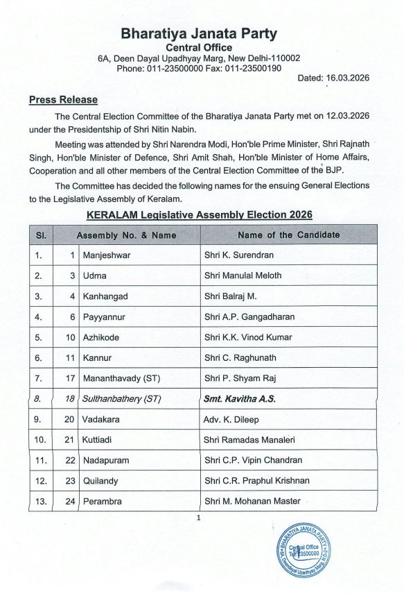 Apart from this, the party has fielded K Chandrasekaran as its candidate from Manjeshwar seat. Whereas, Navya Haridas has been given the ticket from Kozhikode North.